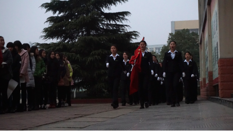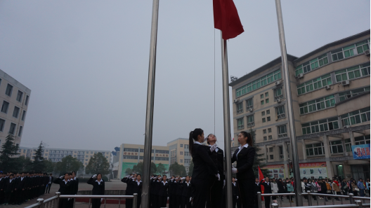 7点整,随着嘹亮整齐的口号声,会计系巾帼护卫队身着校服,脚迈正步,护卫着鲜艳的五星红旗整齐入场。在场师生齐唱《义勇军进行曲》,向缓缓升起的五星红旗行注目礼,仪式庄严肃穆。