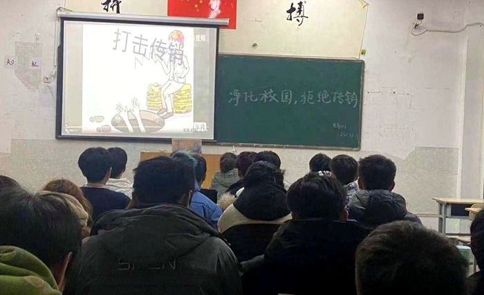 新生入学初期,通过开展校园安全知识专题讲座,让学生了解打击传销的法律法规,自觉做到知法、懂法、守法,增强其对传销的免疫力。各系以班级为单位组织开展“净化校园,拒绝传销”反传销主题班会,通过学习反传销相关知识,观看防范传销宣传视频、知识竞赛等形式,认清传销的违法犯罪性质、欺诈本质和严重危害,提高传销,特别是网络传销的辨识能力,增强防范意识,自觉远离和抵制传销。联合锦绣社区居委会在校园内开展防范传销专题宣传活动,现场发放防传销宣传手册,切实扩大校园防范传销宣传教育活动的覆盖面,营造抵制传销的浓厚氛围。组织志愿者向同学们介绍传销的形式、危害,宣讲打击传销的法律法规。同学们积极主动地在“净化校园,拒绝传销”的宣传条幅上签名,表达自觉远离传销、抵制传销、拒绝传销的信心和决心,切实增强广大学生对传销的识别能力和防范意识。