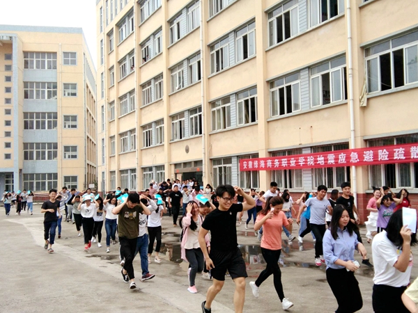1分钟后,指挥部发出:“主震结束,马上撤离”的指令,参演师生双手护头按照预定疏散路线,快速、有序的撤离教学楼向指定集合点疏散。同时,辅导员、保卫人员在楼道、楼梯口等处加以指引、疏导,防止出现拥挤、踩踏。2分50秒后,师生全部安全到达指定疏散点科技楼广场。