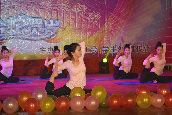 第二篇章《青春似火》,由瑜伽协会的同学们共同上演的《舞韵瑜伽》十分精彩,伴着优扬的音乐,一张一弛,和谐恰当。而最令人难忘的节目当属小品《父母情》,这是一群很普通的学生,但他们却用自己简单的对白、真情的流露,解读着父母亲对儿女们深深的爱,情感质朴感人,现场顿时充满温馨的气氛。手语诗朗诵《倾斜而美丽的世界》独特的手语传送着那些身残志不残的人积极而乐观的心态。民族舞《紫竹调》又将晚会推向一个新的高潮。