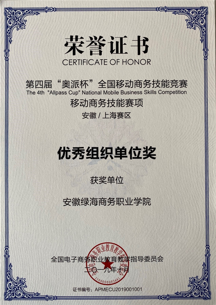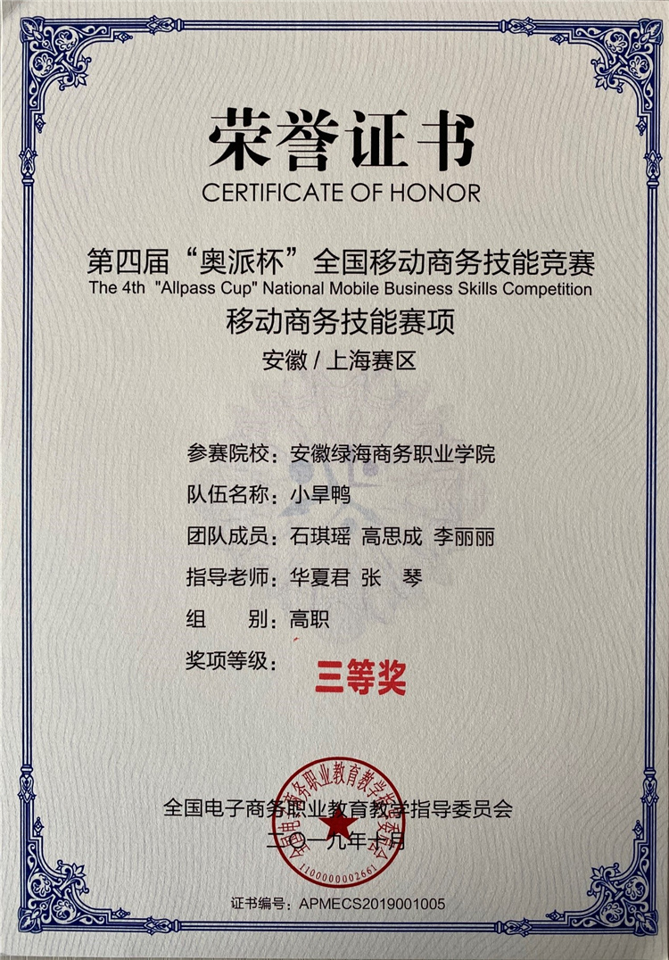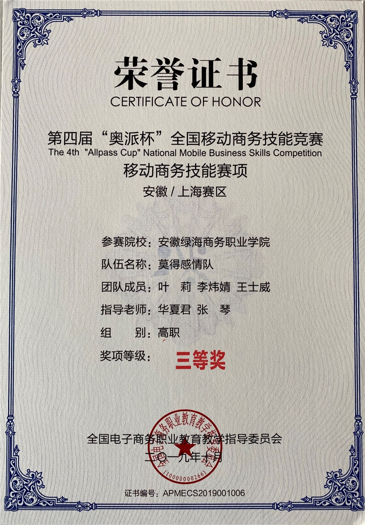 2、2019年11月,电商专业学生参加第四届“奥派杯”全国移动商务技能大赛,均获安徽/上海赛区三等奖