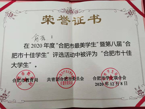 喜报|我院俞蓓同学获评第八届“合肥市十佳大学生”荣誉称号