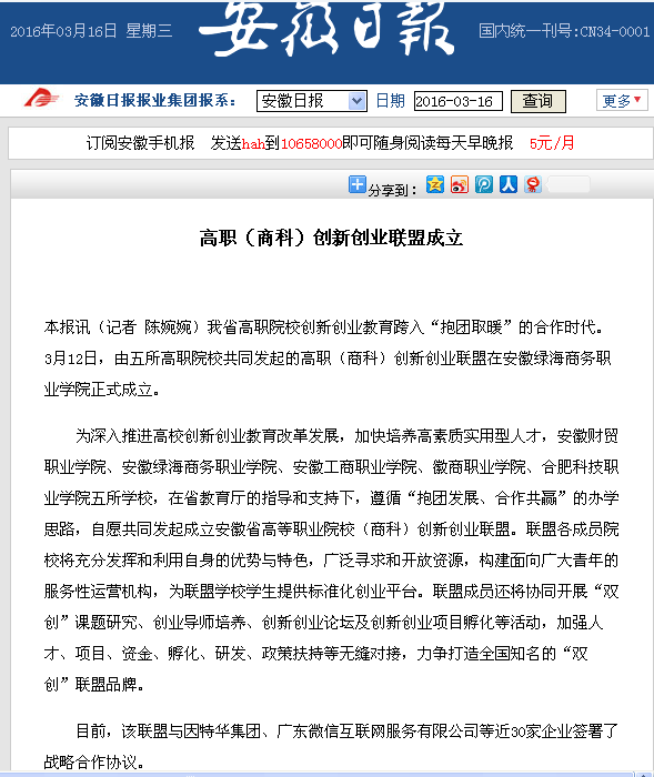 《中国日报》——首届安徽省高等职业院校双创教育理论与实践研讨会在合肥举行