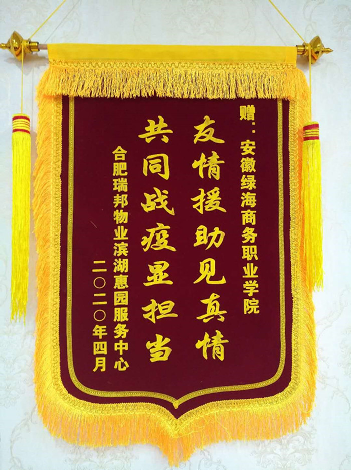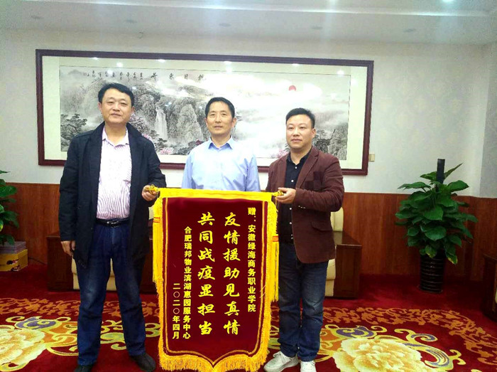 4月28日下午,合肥滨湖惠园小区瑞帮物业为365集团赠送了一面 “友情援助见真情,共同战疫显担当”的锦旗,代表小区居民感谢绿海学院在疫情防控期间对滨湖惠园小区做出的援助和奉献。