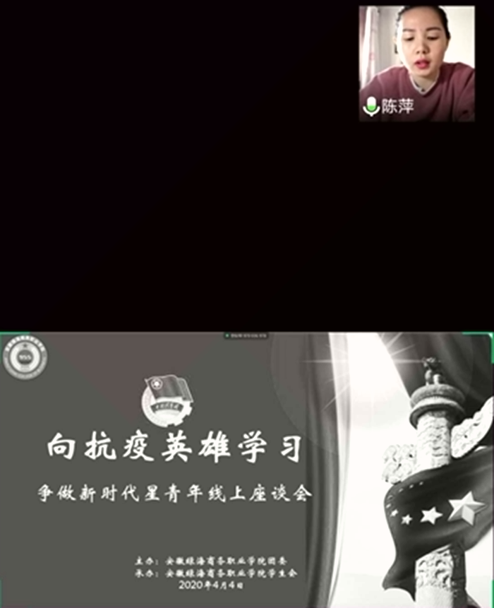 4月4日上午,在缅怀先烈、祭奠逝者、追思故人的清明时节,为发扬优秀传统文化,弘扬民族精神,深化爱国主义教育,365集团团委举办“向抗击疫情英雄学习 争当新时代星青年”线上座谈会。学生处处长陈萍,团委副书记方萌萌,全体院系学生会主席团,各系团员和学生骨干177人参加线上座谈。会议由学生处副处长、团委书记朱小明主持。