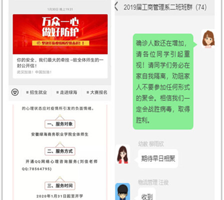 科学引导强信心。面对汹汹而来的疫情,学院自上而下,压实责任链条,组织各级干部开展“拉网式”信息排查,要求辅导员精准掌握每位学生思想状态、身体状况和活动轨迹等信息,及时汇总上报,对有外出史、出现感冒症状的学生重点关注。同时,重点关注家庭经济困难学生,及时回应师生关切,细致解答各种问题。学院专门开通了线上心理支持服务,引导师生稳定情绪、坚定信心。同时通过互联网短文、图片、小视频多种途径和形式开展宣传教育活动,增强学生战“疫”必胜的信心。绿海学子被学院的真情所深深打动。