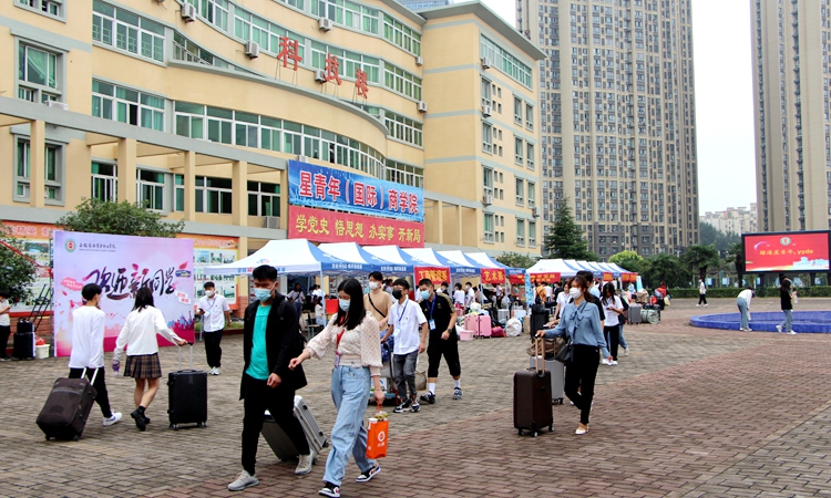 星青年志愿者们活跃在迎新的各个“阵地”,接站、防疫、引导、登记、咨询、入住、领取物资等各个环节,都能看到志愿者们贴心的服务和真诚的笑脸。迎新第一日突降大雨,他们不顾自己被淋湿,帮新生撑伞、搬行李,护送新生安全到校、顺利完成报到。