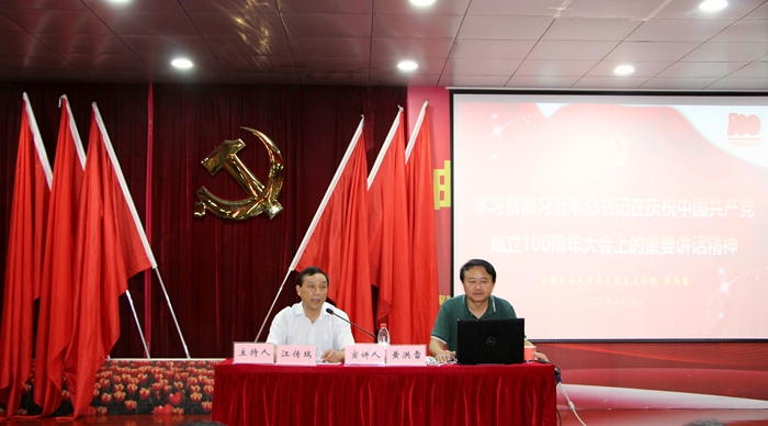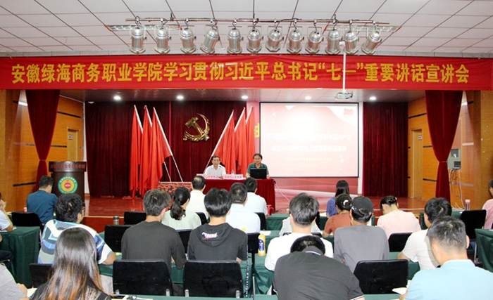 在全国上下深入学习贯彻习近平总书记“七一”重要讲话精神之际,9月14日下午,学院党委举办学习贯彻习近平总书记“七一”重要讲话精神宣讲会。省委宣讲团成员、安徽农业大学马克思主义学院党委书记、院长黄洪雷教授作《学习贯彻习近平总书记在庆祝中国共产党成立100周年大会上的重要讲话精神》主旨宣讲。学院董事长、党委书记陈孝云,党委副书记、纪委书记刘兴杰,党委委员、文化总监张以亭,院长助理陈艺鸣,全院教职工和学生入党积极分子及部分学生代表聆听了报告。督导专员、党委第一书记江传瑞主持会议。