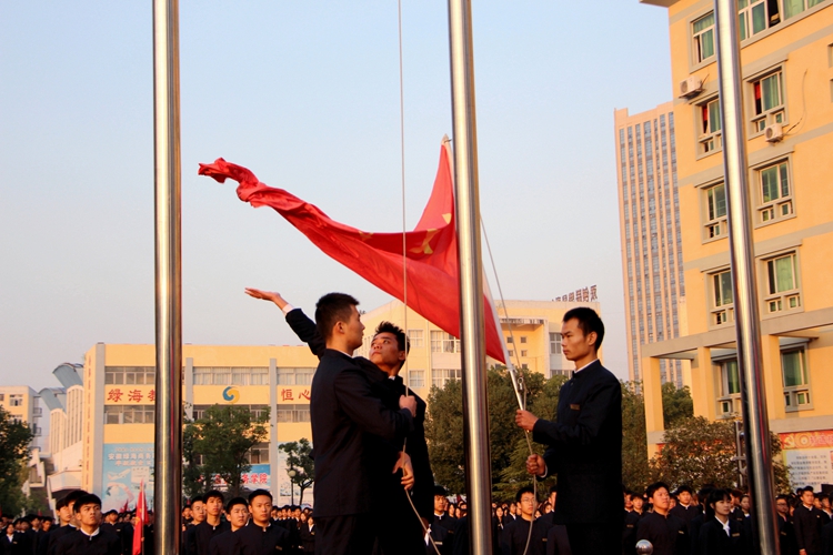 上午7时,国旗护卫队成员迈着铿锵有力的步伐护送国旗入场。伴随着雄壮、激昂的旋律,全体师生庄严肃立,高唱国歌。在师生的注目礼下,鲜艳的五星红旗伴随晨曦冉冉升起,嘹亮雄浑的国歌声响彻校园。