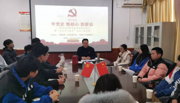为加强对学生党员的教育管理,帮助新发展学生党员进一步树立党员意识,保证党员发展质量,2021年12月11日上午9:00,在学院党委党员活动室,举办了与新发展的党员和部分入党积极分子集体谈话。谈话由纪委副书记、党群工作部部长邓奕成老师主持并做《学党史、悟初心、担使命》党史学习教育主题党课。