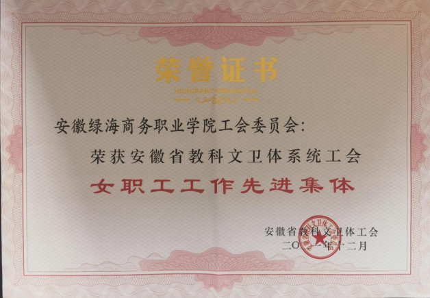 为表彰先进,树立典型,引领全省各级工会女职工组织和广大女职工工作者立足岗位创先争优,刚刚结束的安徽省教科文卫体工会女职工委员会成立暨一届一次全委(扩大)会议,表扬了一批深受广大职工群众信赖和赞誉的工会女职工先进集体和先进个人,我院工会女工委员会荣获“安徽省教科文卫体系统工会女职工工作先进集体”荣誉称号,陈萍同志荣获“女职工工作先进个人”荣誉称号。学院工会女工委主任任婷婷同志代表学院工会参加会议并领取省教科文卫体工会授予的两项奖励。