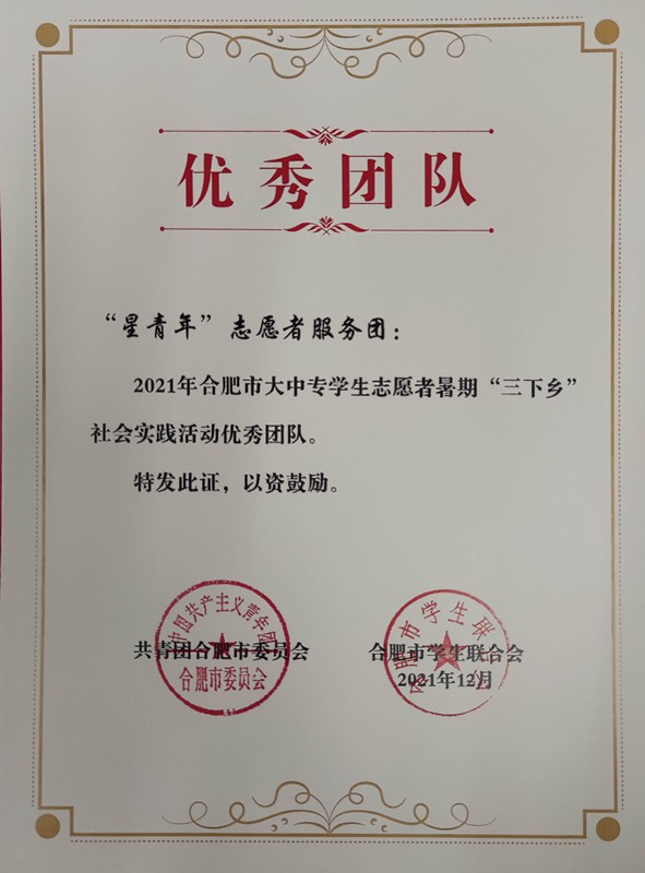 在2021年合肥市大中专学生志愿者暑期文化科技卫生“三下乡”社会实践活动总结通报工作中,我院“星青年”志愿者服务团荣获市级“优秀团队”荣誉称号。