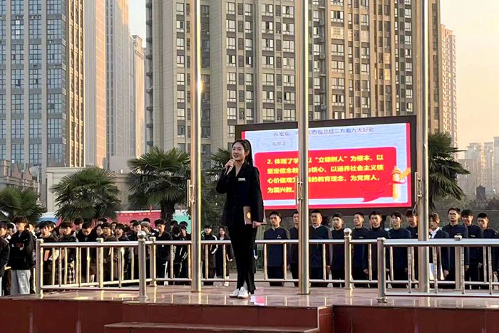陈孝云老师在国旗下讲话中,言辞真切、满含深情高度总结了学院升国旗仪式的九大重要意义。他强调,学院将其作为户外思政教育课堂,引导学生青春永向党、建功新时代、争创新作为。此举作为推进学院“三全育人”工作的具体抓手,鼓励学生自强不息,知行合一,坚定理想信念,以高标准要求自己,以高目标勉励自己,争做最好的时代星青年!