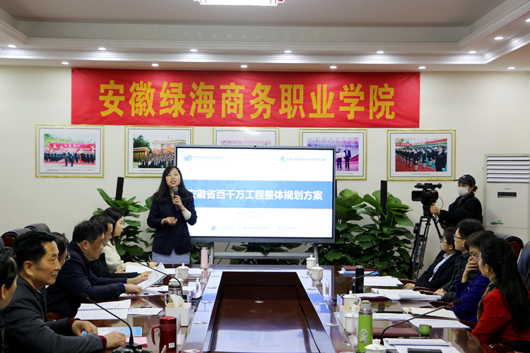 在观看完百千万工程专题视频后,绿海学院、蚌埠学院分别就百千万工程在各院校的融合发展与规划建议进行详细展示交流,圆通科技股份有限公司总经理白雯丽介绍与汇报共建安徽省高等院校百千万工程规划方案。