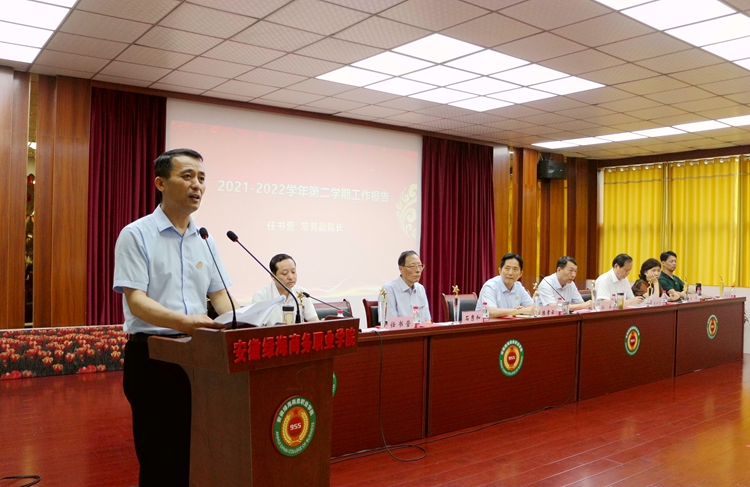 在庄严的奏唱国歌仪式后,常务作2021-2022学年第二学期工作报告。他以“目标引领绿海梦 众志成城谱新篇”为主题,围绕党建思政、“十四五”规划、高水平职业大学建设、三全育人、迎检应检、教育教学、疫情防控、师资队伍、招生就业、基础建设等方面,对取得的成绩进行集中肯定,实事求是地分析了学院工作当前存在的问题与不足,并提出下学期工作目标与计划。