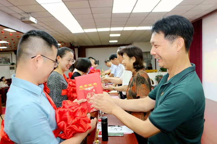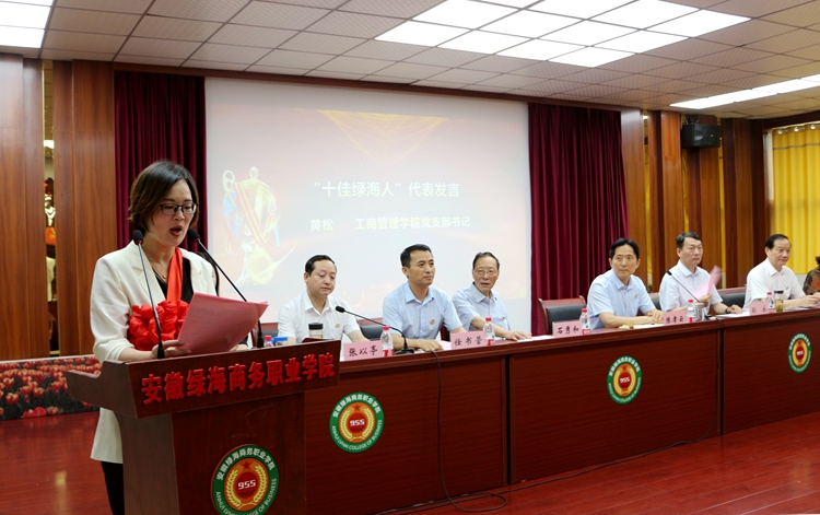 学院领导为朱小明等十名受表彰的教职工颁发荣誉证书及奖杯。工商管理学院书记黄松作为教师代表上台发言,分享了绿海人坚定、坚持、坚守的拼搏之路,代表全体教职员工表态将继续秉承初心,发扬忠诚、笃行、担当的奋斗精神。
