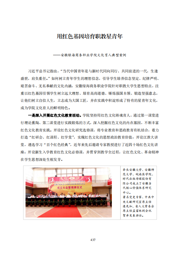 案例《用红色基因培育职教星青年》系学院文化育人典型案例,阐述了学院针对职教大学生思想特点,注重以红色基因引领学生树立远大理想、培育高尚道德、锤炼强国本领、锻造坚强意志,让他们树立自信人生,立志成为大国工匠,并在实践中积淀形成了特有的星青年文化,成为学院文化育人的鲜明特色。