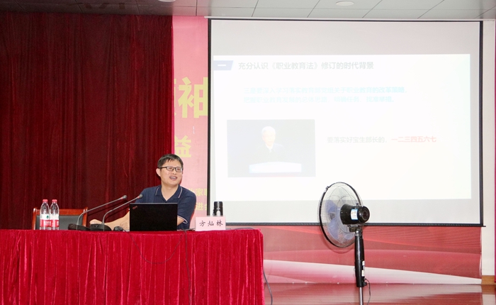 为深入贯彻落实新修订的《中华人民共和国职业教育法》,进一步推进依法治教、依法治校和依法办学,提高全体教职工的法治意识,把握新法精神,落实新法要求,8月19日学院特邀请安徽工商职业学院创建办主任方灿林教授,就新《中华人民共和国职业教育法》作专题讲座。全体教职员工参加了本次讲座。