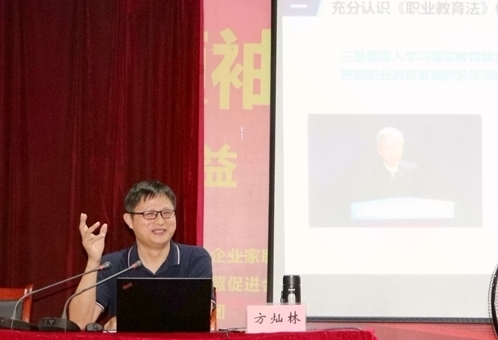 安徽工商职业学院创建办主任方灿林教授,为参训人员作了“深入贯彻落实职业教育法,推进安徽职业教育一体化高质量发展”的主题报告,对新职业教育法修订的时代背景、内涵特征和落地实施进行了详细深刻的解读,并结合我省当前形势剖析了新职业教育法对于职业教育大发展大繁荣的深远意义。