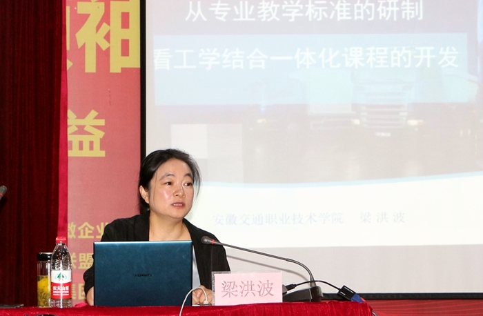 安徽交通职业技术学院汽车系主任梁洪波教授为参训人员做了“从专业教学标准的研制看工学结合一体化课程的开发”的专题讲座。梁洪波教授结合工作实践,从专业标准出台背景、专业简介和专业、标准的体例、工学结合一体化课程开发课程开发过程,逐层剖析了如何做好高职院校的课程建设,并向大家展示了专业课程体系的转化案例。
