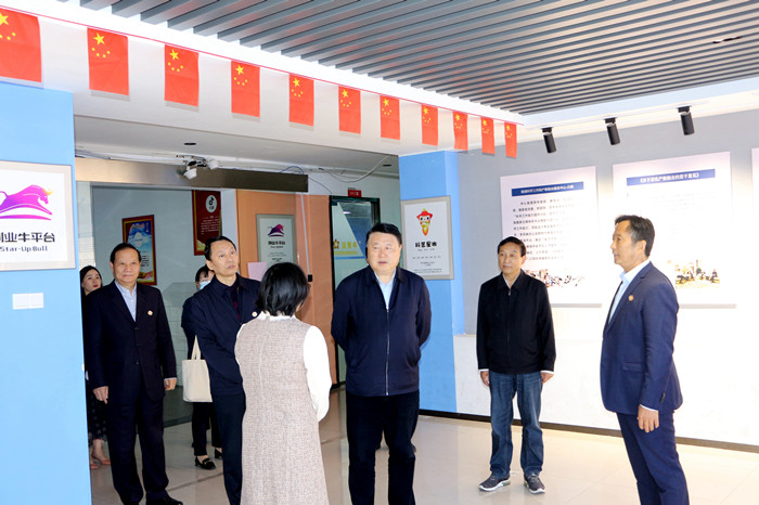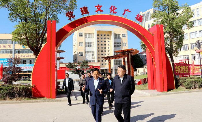 解平副厅长一行首先来到学院党建文化广场,对党建文化广场建设给予充分肯定,指出是学院创建“党建引领示范校”的实际举措,是全面推进“大思政课”建设的具体实践。为深入贯彻新时代党的建设总要求,365集团于今年暑假期间正式启动党建文化广场建设工作。党建文化主题广场的建设,不仅是独具特色的“红色地标”,更是重要的思想政治理论课教学实践基地,是学院深入贯彻落实习近平总书记在学校思政课教师座谈会重要讲话精神的具体举措,也是创新大学生思想政治理论课教学内容、教学方式的有益尝试,是思想政治理论课教学第二课堂的重要补充,让师生群众精神生活有方向、有动力,增强基层党组织的凝聚力和战斗力,为学院实现跨越发展汇聚正能量,提供新动能。