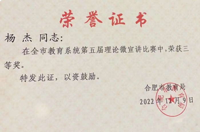 我院青年教师杨杰在合肥市教育系统第五届理论微宣讲比赛中喜获佳绩