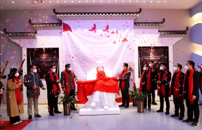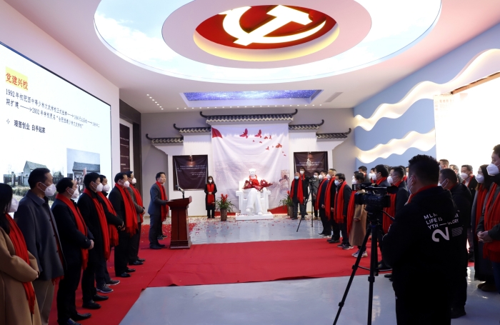 陈孝云董事长、许信旺执行院长共同为毛泽东同志雕像揭幕。两位教师代表向毛泽东同志雕像敬献鲜花。全体人员肃立并向毛泽东同志雕像三鞠躬,表达深切缅怀之情。