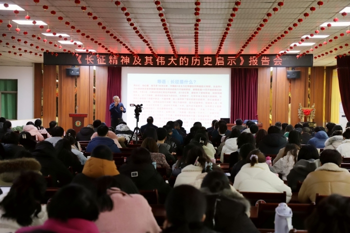 “雪皑皑,野茫茫,高原寒,炊断粮。红军都是钢铁汉,千锤百炼不怕难。雪山低头迎远客,草毯泥毡扎营盘。风雨侵衣骨更硬,野菜充饥志越坚。官兵一致同甘苦,革命理想高于天。”2月8日下午,高级政工师、中国文化管理协会企业文化管理委员会党建与企业文化互助平台共建专家、中共安徽省委讲师团重大主题宣讲专家团成员赵国忠教授,为绿海全体教师带来一场精彩纷呈的《长征精神及其伟大的历史启示》专题报告会。