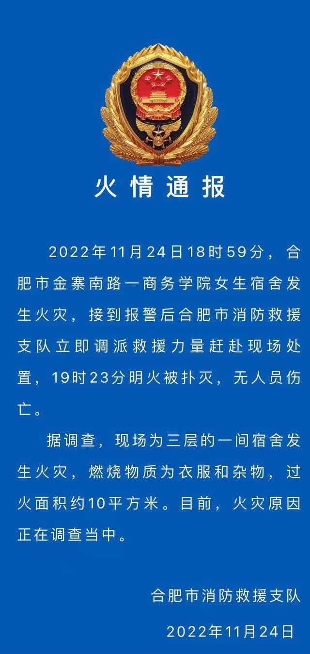 2022年11月24日18时59分,学院一名女生因使用大功率电器引发火情。经学院和合肥市消防救援支队现场处置后,19时23分明火被扑灭,人员全部疏散完毕,无人员伤亡。目前所有学生已妥善安置,火灾原因消防部门正在进一步调查中。