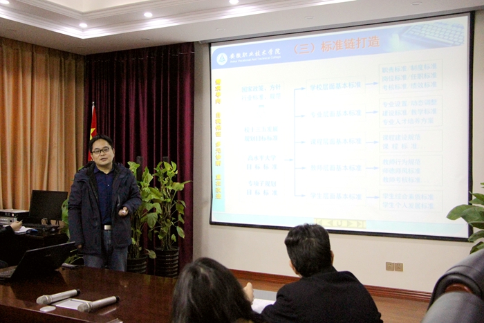 为促进学院内涵建设,深化教育教学改革,进一步推动教学诊断与改进工作,12月10日下午,365集团邀请安徽职业技术学院谢暴教授就学院内部质量保证体系诊断与改进工作进行专题培训。培训会由执行院长亓四华教授主持,学院相关领导和各部门负责人、教研室主任等参会。