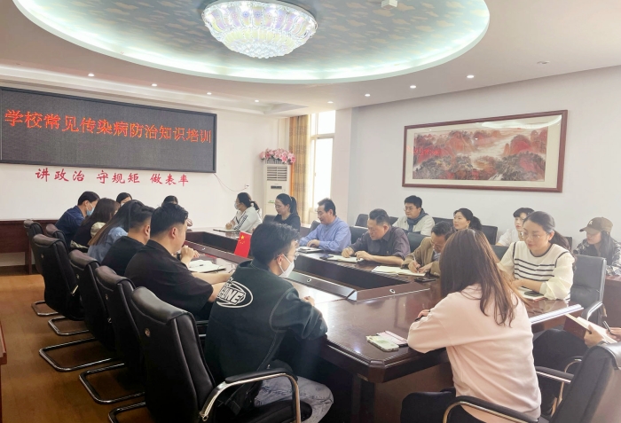 为进一步加强学校传染病防控工作,大力宣传传染病防控知识,提高广大教职员工的自我防护意识和学校公共卫生管理水平,5月23日下午,学生处特邀副校长曹元应为全体辅导员进行常见传染病防治知识培训,总务处负责人邓奕成,学生处负责人高彩霞等相关人员参与培训会。