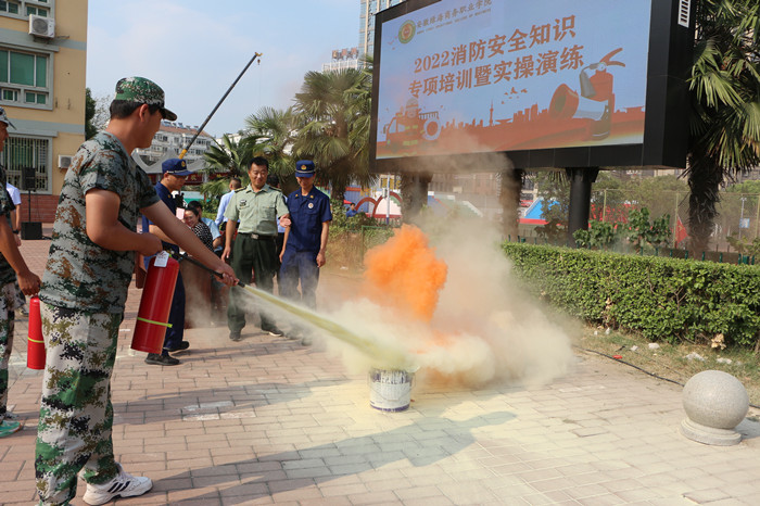 活动中,夏超教官采取面对面讲解和现场操作演示的方式,用生动活泼的语言为全体人员介绍了消防法律法规、常见灭火器材的正确使用、如何扑灭初期火灾、如何火场自救以及逃生等消防安全常识。结合近期发生的几起影响较大的火灾事故案例,从防火、灭火、逃生、自救四个方面,分析了火灾发生的原因,造成的严重后果以及对社会的危害。现场演示了灭火器功能用途以及操作程序。随后,夏超教官现场指导学生代表使用消防设备设施进行实际操作演练,全体参会领导、师生员工进行现场观摩,通过现场演练使大家对消防工作的重要性有了更深刻认识。
