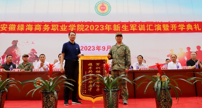 “军训锤炼莘莘学子,携手共育中华英才。”督导专员、学校党委书记孙永向承训部队赠送锦旗并向承训部队致以崇高敬意,向辛勤奋战在训练一线的教官表示衷心的感谢。