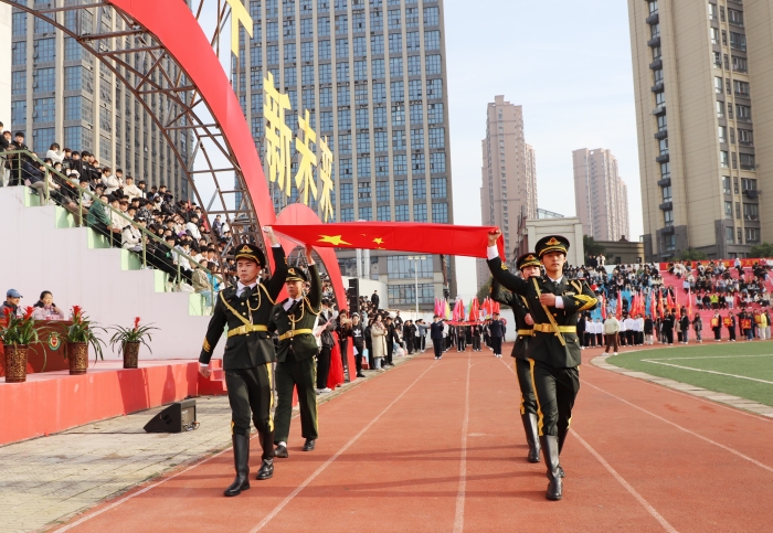 各代表队入场后,在雄壮的国歌声中,大会举行了庄严的升旗仪式,全场师生齐唱国歌。