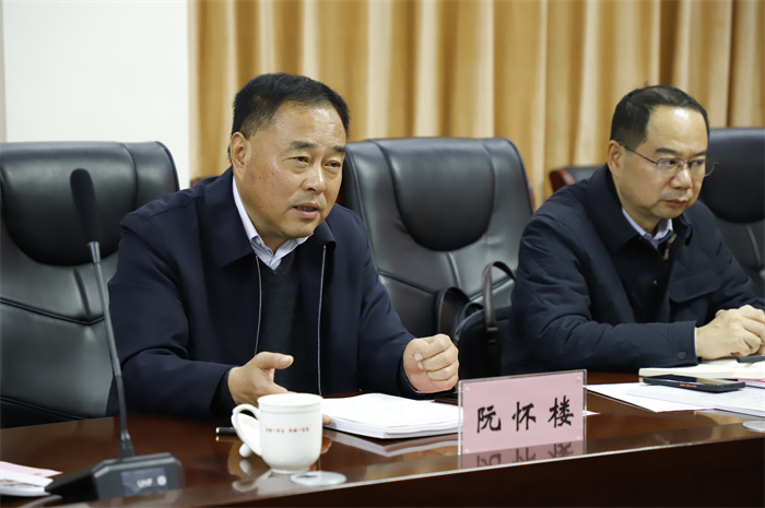 许信旺主持座谈会并致欢迎辞,他首先对阮怀楼一行莅临指导表示热烈欢迎和诚挚感谢,并对学校的办学理念、办学成果、办学特色、办学规模等情况作了简要介绍。他表示,绿海学院全面贯彻落实党的二十大精神,锚定“双高校”建设目标,不断强化党建引领,创新实施“星青年人才培养”,走产教融合、校企合作发展道路,深化教育教学综合改革,构建高质量职教体系等,实现学校“高水平教学、高层次升学、高质量就业”,打造以职业精神为核心,以人文精神和科技精神为两翼的绿海“三牛精神”,服务社会、奉献社会,以高质量发展为教育强国贡献绿海力量。