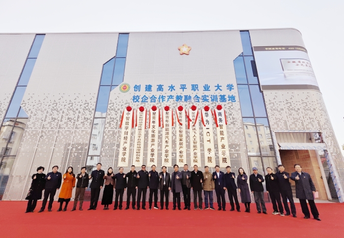 随后,校领导与各二级学院院长分别为数字商贸与直播学院、创建高水平职业大学校企合作产教融合实训基地的“中智数字财经产业学院、国家新闻动漫传播示范平台高校动漫研创基地、星青年文化旅游产业学院、星青年新能源汽车产业学院、星青年海尔智慧家居产业学院、星青年科大讯飞人工智能产业学院、华为ICT学院、商务智能产业学院”揭牌。