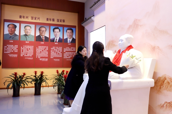 校团委两位老师代表全校师生向毛泽东同志汉白玉坐像敬献鲜花。现场师生肃立,向毛泽东同志汉白玉坐像深深三鞠躬,表达对伟人的崇高敬意和无限追思。