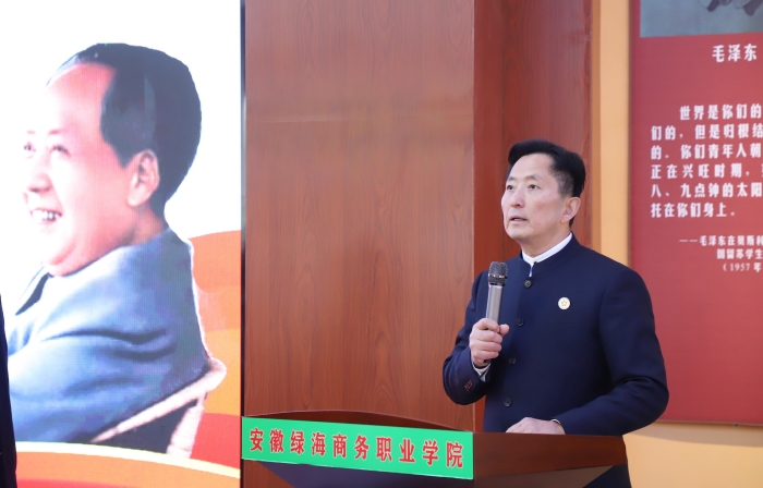 中国红色文化研究会常委、中国红色文化研究会安徽工作委员会主任、安徽当代社会主义核心价值研究中心主任、学校党委副书记、董事长陈孝云在讲话中说,今天是伟大领袖毛泽东同志诞辰130周年纪念日,一百多年前他老人家一首“孩儿立志出乡关,学不成名誓不还。埋骨何须桑梓地,人生无处不青山”的壮丽诗篇,至今仍振聋发聩、催人奋进,激励着一代又一代青年砥砺前进,筑梦中国。