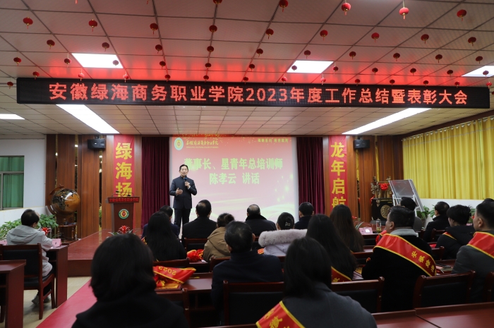 安徽数字创意职业教育集团理事长、学校董事长、星青年总培训师陈孝云老师作总结讲话。他对2023年度学校各方面工作成效给予充分肯定。他指出,2023年学校发展喜事不断、标志性成果丰硕、亮点工作突出,各项事业取得了长足发展。他代表学校董事会、党政领导班子向全体教职员工表示诚挚的感谢,向受到表彰的先进单位和个人表示热烈的祝贺。现场陈老师与大家互动不断,对“颂绿海2023”教职员工自创诗歌进行评选,表达了对绿海学院发展深深的祝愿与祝福。陈老师对星青年十大成长成才“通道”和“基因密码”逐一解析,表达了对绿海家人们的热切期望,共享了成功智慧,赋能了发展道路,指明了目标方向,通过对学校工作的顶层谋划,明晰了学校新年度新的建设路径、具体指标。陈老师讲话走心、用情,他心系全体学生,心系教职员工,心系职教事业;体现了教育大情怀,职教大情怀,绿海真情怀,体现了关心成长的期待之情,关爱幸福的生活之情。陈老师勉励全体教职员工牢记“相信”、“专注”、“聚能”、“显效”、“独特”五个词的内涵,秉承“自强不息、知行合一、合作共享、内圣外王”核心理念,期望全体绿海人要有“成大事的胸怀、做大事的信念、干大事的担当、为大事的灵魂、行大事的的路径”。陈老师最后指出,信仰是灯塔,可以照亮黑夜里的道路;信仰是火焰,可以让奋斗者凤凰涅磐,浴火重生。勉励大家坚定信仰、心怀理想、同心同德、砥砺奋进,推动学校的各项工作迈上新台阶,实现新发展。