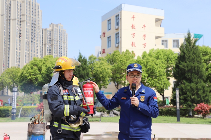 应急疏散演练完毕后,经开区消防救援大队丹霞救援站黄宣铭站长向现场师生详细介绍了“如何扑灭初期火灾”、“火灾安全疏散逃生”等消防安全知识,讲解灭火器材装备的性能、用途及操作要领,指导实操灭火器环节吸引了不少同学踊跃参与体验。