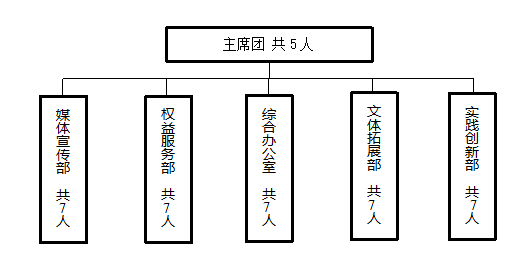 第十六条 校学生会设以下职能机构:综合办公室、媒体宣传部、权益服务部、文体拓展部、实践创新部。各职能部门设部长1名,副部长1-2名,干事不超过6名。