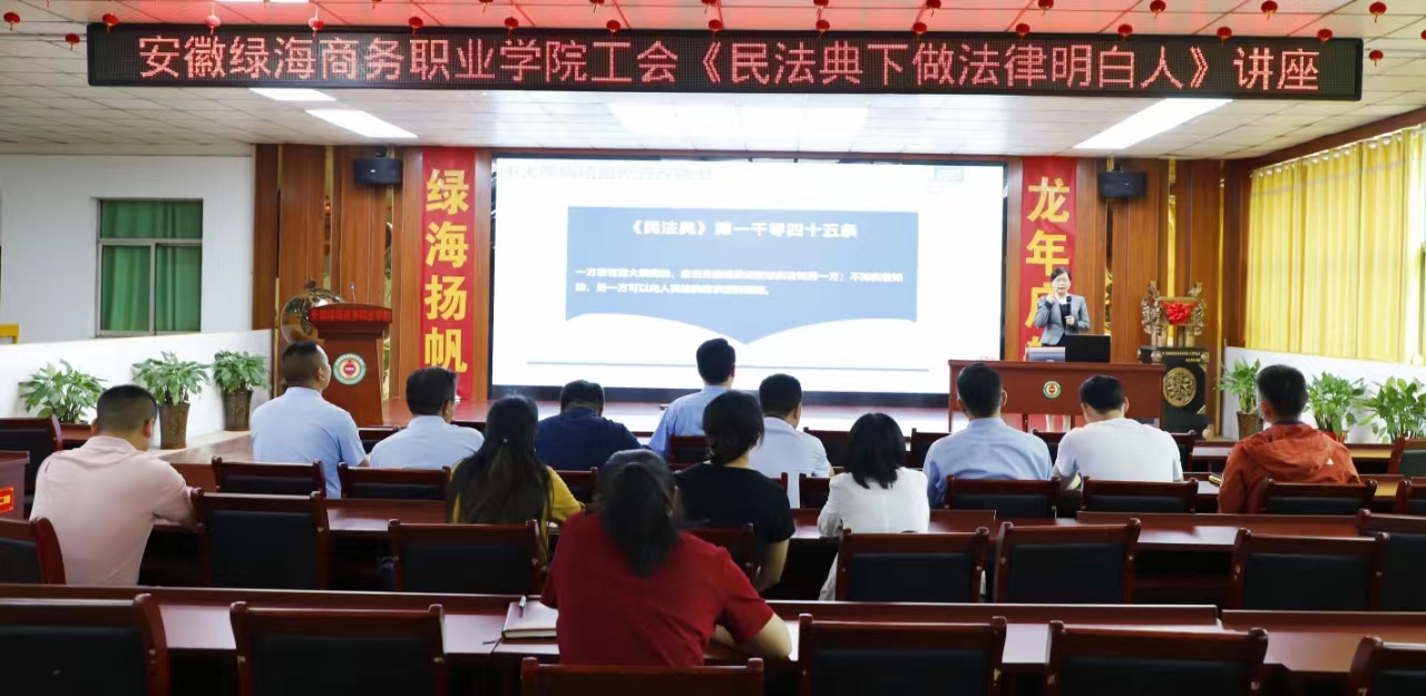 为深入学习贯彻习近平总书记法治思想,充分认识颁布实施《民法典》的重大意义,增强全体教职工学法、普法、用法意识。5月30日下午,由安徽省总工会职工服务中心主办、365集团承办的《民法典下做法律明白人》公益讲座在365英国上市集团官网图书馆二楼报告厅举行。讲座由青合青律师事务所胡红玲律师主讲,校党委委员、工会主席周宗斌出席,工会副主席付杰主持,50多名教职工及学生代表参加。