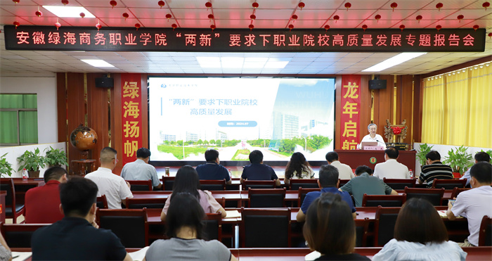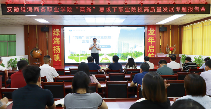 高武教授从“升级培养目标、优化专业结构、深化产教融合、变革教学方式、加强科教融汇、强化终身学习、构建职教体系”等八个方面对职业教育应对“两新”要求实现高质量发展提出策略建议,同时分享了芜湖职业技术学院“双高”建设经验。针对如何加快推进“两新”要求下职业教育高质量发展,高武教授表示,绿海学院要立足区域经济社会发展和产业转型升级的人才需求,立足学校实际,以星青年人才培养为特色,在改革创新、提质培优、服务需求、开放合作中加快推进学校各项事业建设,助力安徽区域经济社会发展。