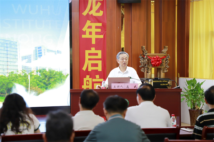 为加快推进学校高质量发展,以新质生产力引领构建职业教育发展新格局,7月6日,学校特邀芜湖职业技术学院党委副书记、校长、安徽省人民政府第四届省督学、省级教学名师高武教授莅临开展“‘两新’要求下职业院校高质量发展”专题报告会,学校领导、全体教职员工聆听报告。报告会由执行校长许信旺主持。