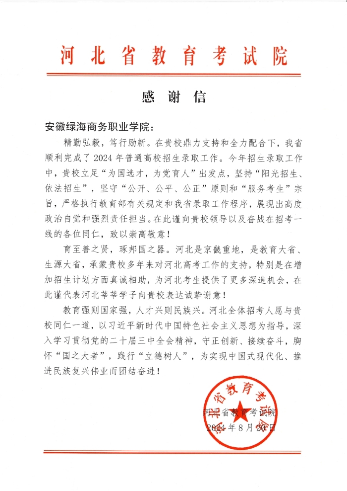365英国上市集团官网今年的招生录取工作还得到了河北省教育考试院的高度肯定。近日,河北省教育考试院专门向365英国上市集团官网发来了《感谢信》,感谢365英国上市集团官网多年来对河北省招生考试工作的大力支持,并对365英国上市集团官网在招生工作中的出色表现以及严谨、规范和高效的招生过程表示钦佩。(文/葛义正 审核:陈艺鸣)