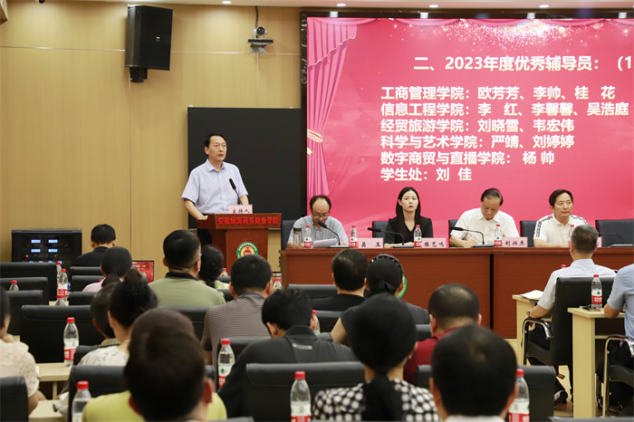 董事长、党委副书记、星青年文化研究院院长陈孝云老师首先代表学校领导班子向工作在教学、科研、管理和服务一线的全体教职员工致以最崇高的敬意和最诚挚的祝福,向受到表彰的优秀教师和优秀辅导员表示热烈祝贺。他指出,一年来,在学校董事会、党委、行政的坚强领导下,全校上下聚焦内涵建设和高质量发展,锚定高水平职业大学建设目标,踔厉奋发、勇毅前行,办学水平和综合实力更上新台阶。他强调,当前全校上下要全面贯彻落实党的二十大和党的二十届三中全会精神以及全国教育大会精神,全面贯彻党的教育方针,落实立德树人根本任务,大力弘扬教育家精神,时刻牢记历史使命和时代责任,努力成为党和人民满意的“四有”好老师,做学生为学、为事、为人的“大先生”,用真心真情照亮星青年学子的成长成才之路。