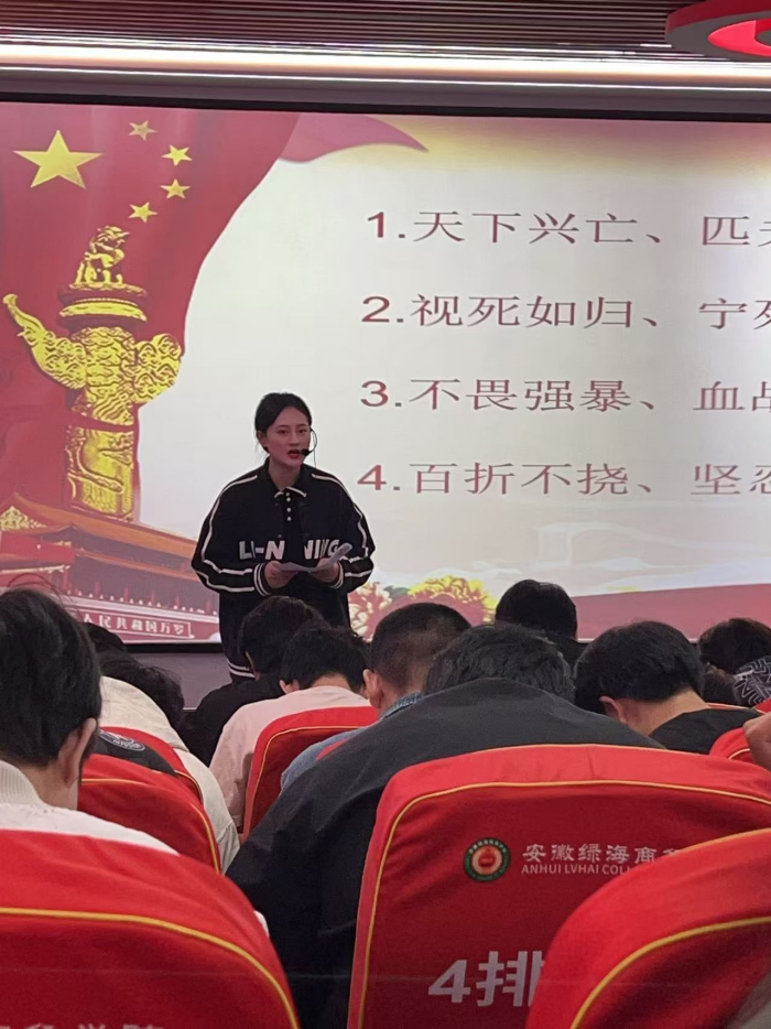 思政课教师董颖凤的宣讲以“弘扬抗战精神,传承红色基因”为主题,从伟大抗战精神产生的历史背景、深刻内涵、时代价值等方面,向在场学生进行了深入简出的阐述,并以互动讨论的形式引导大家思考伟大抗战精神对于当代青年的启示。用标志性的历史事件和一个个英雄人物的故事,引导大家感悟精神伟力、担当历史重任,赓续共产党人的精神血脉。她强调,抗战精神是中华民族宝贵的精神财富,是激励我们不断前行的强大动力。我们要铭记历史,砥砺前行,以更加昂扬的斗志、更加坚定的信念,为实现中华民族伟大复兴的中国梦而努力奋斗!