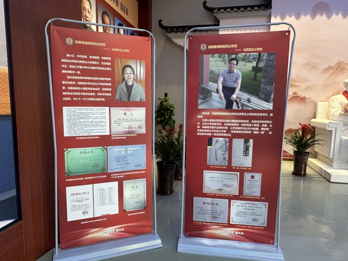 随后,各位党员教师驻足观看一幅幅生动的图片、一件件详实的展板。展板展示内容主要通过图文并茂的形式,系统介绍各项教学科研成果的基本信息,涵盖了近几年来我院教师在教学改革项目、精品课程建设、教材编写、学生竞赛指导、教学论文发表、各类比赛获奖等方面取得的丰硕成果。党员教师们边走边看,边听边议,不时驻足交流心得,深切感受到了学院在教育领域的蓬勃发展。这些成果不仅体现了教师们扎实的专业素养,更彰显了马克思主义学院在培养新时代优秀人才方面的突出贡献。
