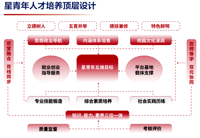 学校党委紧扣立德树人根本任务,坚持文化塑校,将星青年培养与“四史”教育相结合、与中华优秀传统文化教育相结合、与思政课改革创新相结合、与创新创业教育相结合、与职业实践教育相结合、与社会责任教育相结合。构建了以“三大文化”为主脉,以学校办学理念为重点,以星青年文化为特色,以君子文化、红色文化、工匠文化、科技文化、双创文化、社会实践文化等为内涵体系的绿海文化大厦。
