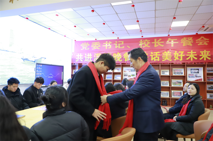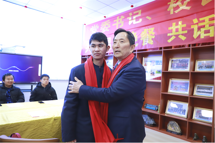 陈老师给每一位同学戴上了温暖的红围巾,送上了爱心礼物,并受邀和学生们热情拥抱。他为大家的梦想和勇敢点赞,激励同学们大胆表达、勇于逐梦,让心更光明,情怀更深厚,努力成为敢于面向未来、能够承担未来的时代星青年。